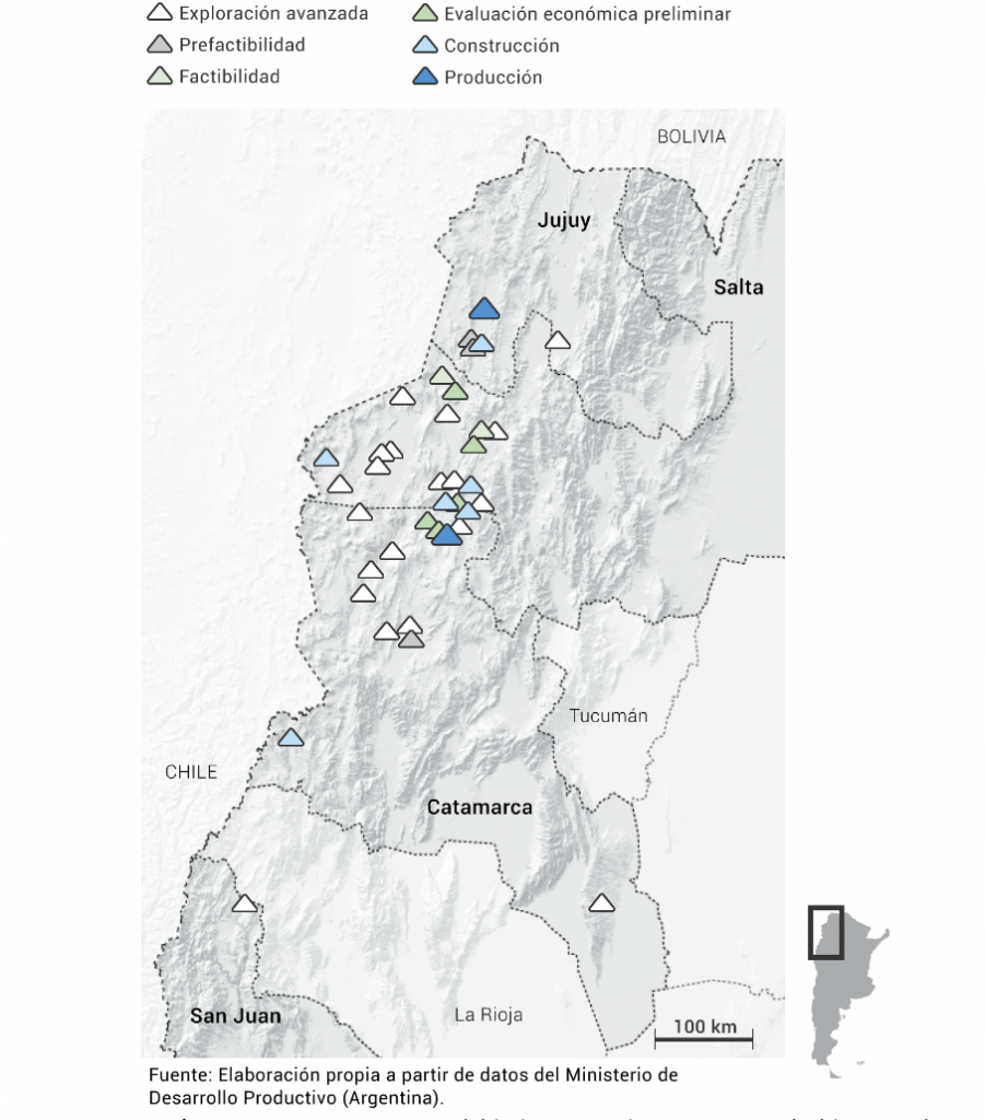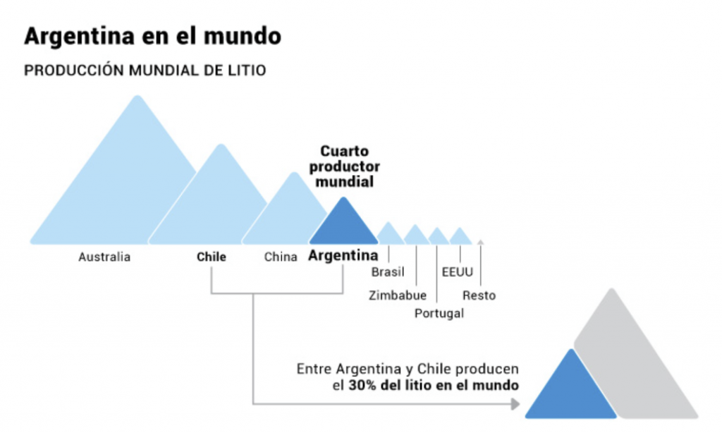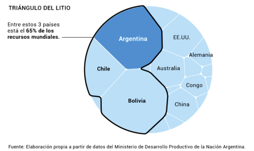 Argentina es uno de los cuatro productores mundiales más grandes de productos derivados del litio. Junto a Chile y Bolivia integra el “Triángulo del litio”, con un 65% de los recursos mundiales. Argentina y Chile producen actualmente 30% del litio en el mundo. Y sólo Argentina tiene el 20,5% de las reservas mundiales.