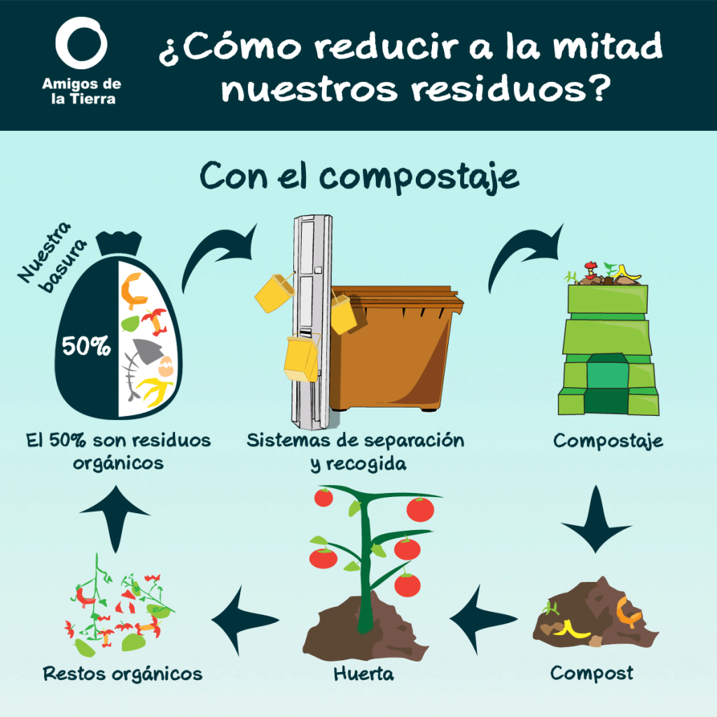 Los restos orgánicos (restos de comida en su mayoría) de los hogares representan valores cercanos al 50% de los residuos que gracias a la separación en origen, pueden ser reciclados y retornados a la tierra en forma de humus para las plantas y cultivos. El compostaje es el proceso de transformación de la materia orgánica para obtener el llamado compost.
