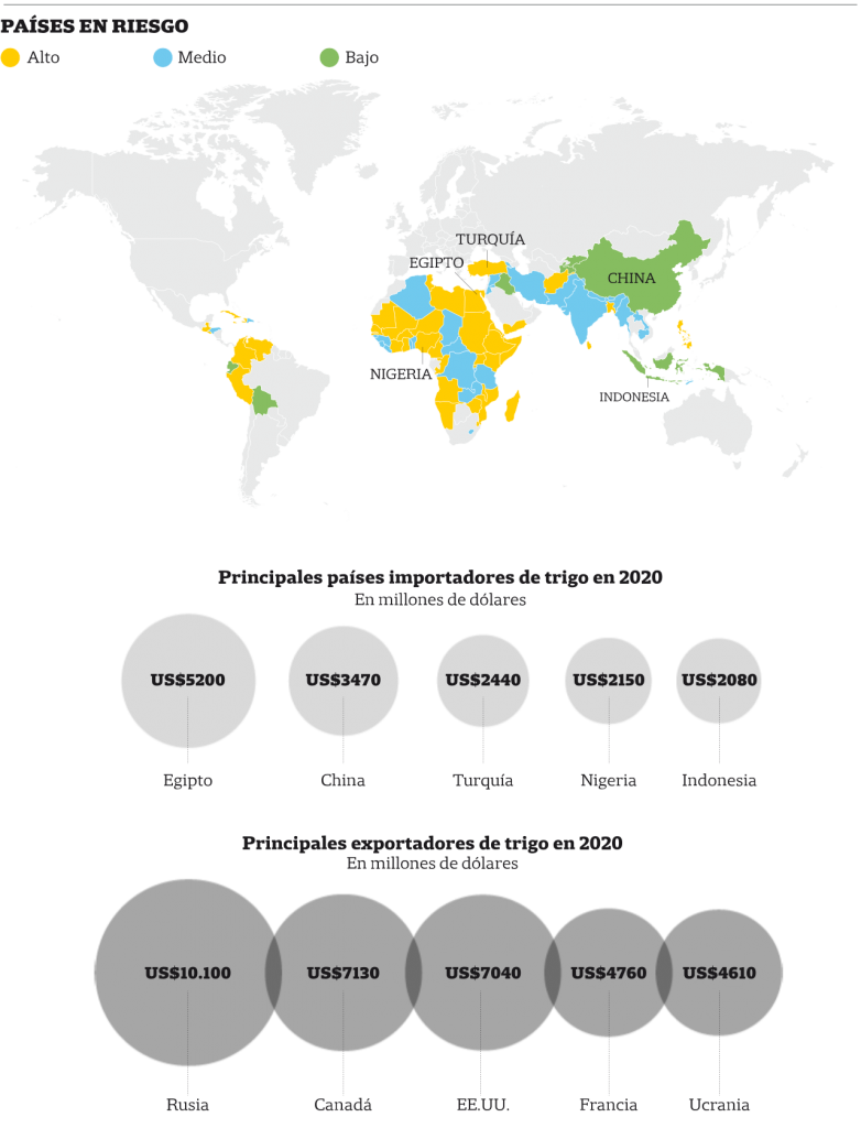 Rusia y el país invadido suman la tercera parte de las exportaciones mundiales de trigo, principal fuente de alimento en muchos países con un consumo superior a su producción.