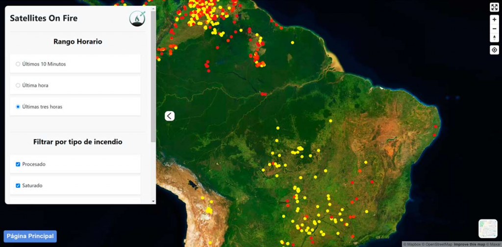 SOF ofrece una plataforma web que abarca todos los focos de incendio en América filtrados según el tipo de punto de calor (saturado, contaminado por nubes, etc).