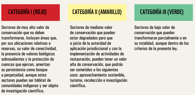 Uno de los aspectos centrales de la Ley es la obligatoriedad de que en cada jurisdicción se realice un ordenamiento territorial de bosques nativos. Consiste en definir los territorios en categorías de conservación. Cada categoría está relacionada con el nivel de riesgo que posee ese territorio, en base a esto se le asignan planes de acción de solución.